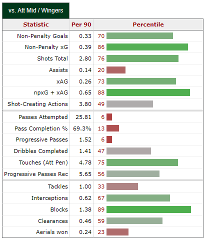 Not all is rosy, in terms of shot-creating actions he is only in the 49th percentile. While he is now bagging goals, it would be preferable if this aspect of his game were also to improve.